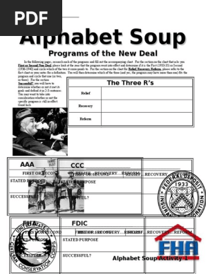 New Deal Alphabet Soup Activity : Roosevelt's new deal platform created an incredible number of different federal agencies to carry out new policies and .. New deal alphabet soup handout. Students will work in groups to research one new deal . New deal "alphabet soup" agencies. Copy and paste these terms to use in the poster activity. Roosevelt's new deal platform created an incredible number of different federal agencies to carry out new policies and .